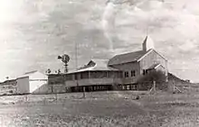 The dismantled church was railed to Birdum and then trucked the remaining distance.[5] The trucks carrying the dismantled church were caught in floods at Daly Waters and parts of the loads were left on the roadside. Spread out along the route for some time, it became known as the "longest church in Australia". While the church was reconstructed, mass was held "in the residence of some local Catholic".[6] The relocation was expensive, and by the time it was opened on 21 November 1937 by Bishop Raible[7][8][9][lower-alpha 2] had cost "many hundreds of pounds". The church was reconstructed in a different layout that in its original location.[1] An office and verandahs were later built "on two sides to serve as accommodation for the priest".[10]
