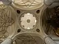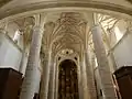 The rectangular floor plan is divided into three parts (naves) of equal height, with the central nave wider than the surrounding two. The naves are separated by thick columns, topped with classical cornices and capitals. On them rest the late-Gothic roof ribs, with liernes over the aisles.