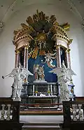 The altarpiece is the work of Nicodemus Tessin and is considered a masterpiece. It depicts a scene from the Garden of Gethsemane between two columns, where Jesus is comforted by an angel while another angel hangs in the air beside them, carrying the golden chalice. On each side, two figures of Pietas and Justitia illustrate the King's motto. The two columns carry a broken, curved architrave and gable. Behind the opening of the broken gable is placed a pane with Jahve's name in Hebrew inscribed and lit from behind. Around the pane is an arrangement of gilded beans and cloud formations.