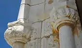In the inside of the entrance doors are two Manueline columns, one on each side, on which are carved various figures framed in little niches. The long procession of figures probably alludes again to the supremacy of Christianity over Islam. One can pick out various musicians (with tambourines, bagpipes, violas, etc.), members of the regular and secular clergies, nobles, simple people, and slaves. These columns were only rediscovered in 1946; up to then they had been completely encased in thick layers of plaster and whitewash.[24][25]