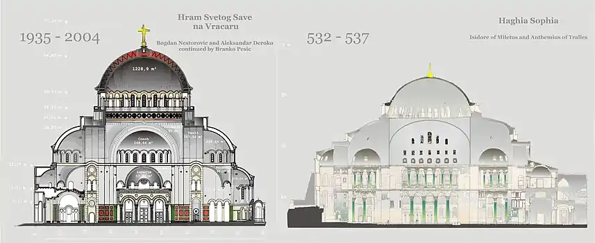 The Temple of Saint Sava (Serbian: Храм Светог Саве / Hram Svetog Save, lit. 'The Temple of Saint Sava'[a]) is a Serbian Orthodox church which sits on the Vračar plateau in Belgrade, Serbia. It was planned as the bishopric seat and main cathedral of the Serbian Orthodox Church. The church is dedicated to Saint Sava, the founder of the Serbian Orthodox Church and an important figure in medieval Serbia. It is built on the presumed location of St. Sava's grave. His coffin had been moved from Mileševa Monastery to Belgrade. It was placed on a pyre and burnt in 1595 by Ottoman Grand Vizier Sinan Pasha. Bogdan Nestorović and Aleksandar Deroko were finally chosen to be the architects in 1932 after a second revised competition in 1926/27 (for which no first award was granted, Nestorović being runner up). This sudden decision instigated an important debate in interwar Yugoslavia which centred around the temple's size, design and symbolic national function.[6][7][8][9][10] This was accompanied by a sizeable increase in the base area of the ambitiously conceived project. The new design departed from the competition guidelines issued in 1926, and was to replicate the dimensions and architecture of Hagia Sophia.[11]