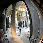 It is the largest Orthodox church in Serbia, one of the largest Eastern Orthodox churches and it ranks among the largest churches in the world. It is the most recognisable building in Belgrade and a landmark, as its dominating dome resembles that of the Hagia Sophia, after which it had been modelled.[14][15] The church contains a rigorous symmetrical layout with a great sensitivity to light due to its large dome and four apses. Its interior cladding with 12,000 m2 (130,000 sq ft) of gold mosaics is almost complete. The initiative for the mosaic decoration inside the dome was secured by a donation of the Russian Federation, while the larger remainder of the mosaic cladding was succesivley financed by the Republic of Serbia. The Russian state, assured by a Decree of the President of Russia Vladimir Putin, secured 2016 $5 million from Gazprom Neft for the great dome mosaic.[16] The mosaics have been designed by the artist Nikolay Aleksandrovich Mukhin from the Russian Academy of Arts of the Imperial Academy of Arts under supervision of its director Zurab Tsereteli. The first mosaic of the dome was finished on 13 December 2017,[17] for which Sergey Lavrov was presented at an official act of state at the church on 22 February 2018.[18] Vladimir Putin visited the church on 17 January. 2019, when he announced that the Russian state will finance parts of the remaining works in the mosaic cladding.[19] He symbolically laid a stone in a mosaic with the presentation of the Mandylion.[20] The artistic work was finished in December 2020, Vladimir Putin had been officially invited,[21] due to the Corona Pandemic only a minor service was held with Sergey Lavrov. After the Hagia Sophia was converted to a mosque in July 2020 the Patriarch of the Serbian Orthodox Church Irinej and the President of Serbia, Aleksandar Vučić on 20 August 2020 expressed their wish, that the Saint Sava Church might indirectly replace the Hagia Sophia after which it was modelled, and become a ″New Hagia Sophia″.[22]