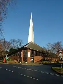 St George's Church is an Anglican church of modern design in the Parish of Norton in Letchworth Garden City in Hertfordshire. Opening in 1964 and arrow-shaped with a 120-foot concrete spire, the congregation are seated in a semi-circle facing the altar. The church building is in the style of the Liturgical Movement following World War II. It was Grade II listed in 2015 for "its striking architectural form, expressed through a diverse range of materials to provide an innovative building of real quality both in composition and detailing."[1]