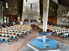 The church "is unconventional in its form, with an arrow-shaped plan and fan-shaped seating arrangement focusing on a forward altar and communion rail at the north-east end"[1] which enables the entire congregation to have an uninterrupted view. The use of unadorned concrete and natural wood were intended as a reminder of the simplicity and poverty of the life of Christ.[2][3] The circular black concrete font is placed around the only pillar in the church, to symbolise that as the pillar physically supports the church so does baptism support the Church.