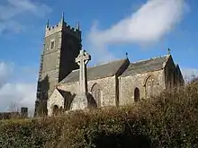 The church of St. James is in the Gothic style.[1] The walls are of coursed slate stone rubble with some granite ashlar in the buttresses of the tower. The roof is gable ended, covered in slate with decorative ridge tiles from the late 19th century.[7] There is a four-stage tower with battlements at the western end with angle buttresses, with a crouching animal gargoyle on top of each buttress.[7] The tower holds six bells. The first two are dated 1620 and the third is dated 1629. The tenor bell has an inscription in old English characters dedicating it to St. George. In 1911 two new bells were added to commemorate the coronation of King George V.[1]