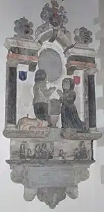 Nearby is the mural monument to Anthony Dennis (died 1641) of Orleigh Court and his second wife Gertrude Grenville flanked by Ionic columns. Beneath them are figures of his eleven children, eight of whom are kneeling and three lying down, indicating their deaths in infancy. The tablet was erected in 1643.