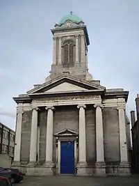 In 1860, the architect Patrick Byrne was commissioned to enhance the church. He added the main exterior features of the church such as the ionic portico, pediment, bell-tower and cupola.[3]