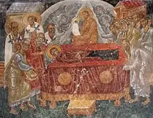 Next to the apse is a mural of Saint Cyril of Alexandria, captioned as "Saint Cyril the Philosopher", the 9th-century missionary to the Slavs.[3] Although the position and iconography of the portrait clearly identify it as an image of Cyril of Alexandria, the caption hints that the local population confused the two saints and Cyril the Philosopher was still well-remembered at the time.[1] Other images painted in the church include these of the Dormition of the Mother of God (above the entrance), the Transfiguration of Jesus (under the vault), John Damascene, Cosmas of Maiuma, Archangel Michael (south of the entrance), Saint Constantine and Saint Helena (right of the entrance).[3]