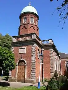 The original building and additions are in the Queen Anne style.[5] The exterior of the building consists of red brick and a stone entablature and balustrade supported by Doric pilasters and the window architraves are of moulded stone. The tower at the west end of the nave has an octagonal brick upper storey with a copper cupola. Inside, the nave is covered in a coved plaster ceiling. The chancel and transepts were constructed between 1860 and 1866. It is the earliest classical church surviving within Birmingham.[1] On each side of the nave are three semi-circular headed windows. The roof is slated.[6]