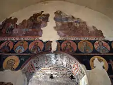 The church's upper story features fragments of frescoes, mostly on the interior, though there are traces of mural painting on one of the blind arches as well.[2] The interior includes images of the Baptism of Christ, Pilate's Court, the Dormition of the Mother of God and the Crucifixion of Jesus. Among the portraits of saints that can be recognised are John the Baptist, the apostles Peter and Paul, Constantine and Helena and the Forty Martyrs of Sebaste. Military saints were depicted on the south wall, while the north wall mostly features monks. All of the preserved frescoes were done in the 14th century and are an example of Palaiologan art. All captions to the frescoes are in Medieval Greek.[4]