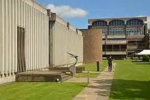 Hepworth's Four-Square (Walk Through) stands at the West Door, the west exit of the main college complex. In 1968, it replaced an earlier Hepworth sculpture, Squares with Two Circles (BH 347) which had been sold to a private collector.[18] Two sculptures by Nigel Hall stand in front of the main gate of the college: The Now (1999) and Southern Shade I (2010).[19] Mistry's Diagram of an Object (Second state) used to be found at the front of college, but is now located next to the chapel at the far end of the college. Sir Anthony Caro's Forum used to stand near the front gate of the college but it was removed in 2004 and replaced in 2007 by Lynn Chadwick's Beast Alerted 1.[20]