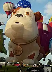Churchill was voiced by Bob Mortimer.[20] Older adverts had Mortimer's voice responding to questions posed by his comedy partner Vic Reeves. In April 2005, however, Reeves was removed from the adverts, after he was convicted of drink driving.[21] In 2004, a hot air balloon of Churchill was unveiled, and was the United Kingdom's largest special shaped hot air balloon, measuring 34 metres wide by 24 metres high.