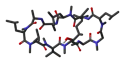 Ciclosporin is a cyclic peptide of 11 amino acids; it contains a single D-amino acid, which is rarely encountered in nature. Unlike most peptides, ciclosporin is not synthesized by ribosomes.[27]