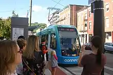 The Cincinnati Bell Connector, previously known as the Cincinnati Streetcar, is a streetcar system in Cincinnati, Ohio, United States. The system opened to passengers on September 9, 2016.[1] The streetcar operates on a 3.6-mile (5.8 km)[2] loop from The Banks, Great American Ball Park, and Smale Riverfront Park through Downtown Cincinnati and north to Findlay Market in the northern edge of the Over-the-Rhine neighborhood. Future extensions have been proposed to the Uptown area, home to the University of Cincinnati, the regional hospitals on Pill Hill, and the Cincinnati Zoo; and to Northern Kentucky.