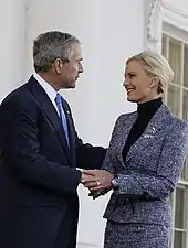 She was active and visible in her husband's second presidential campaign during 2007 and 2008,[14] despite not wanting her husband to run initially due to bad memories of their 2000 experience and worries the effect on her children, especially son Jimmy who was headed to serve in the Iraq War.[54] She eventually supported her husband in his goals, but defined her own campaign roles;[54] she frequently returned to Arizona to attend to domestic duties[60] or interrupted campaigning for her overseas charitable work.[34][65] She preferred to travel with her husband and introduce him rather than act as a campaign surrogate with a separate schedule.[32][69] She wore her hair in a fashionable but severe style and was sometimes seen with an unsmiling countenance in her appearances.[50] In August 2008, a member of the public shook her hand very vigorously, aggravating her existing carpal tunnel syndrome condition and causing her to slightly sprain her wrist.[70] The campaign exacerbated her migraine headaches and she sometimes had to wear dark glasses to shield herself from bright lights.[47][49] The pressures of the campaign also brought out a range of behaviors between her and her husband, varying from moments of great tenderness and concern to raging arguments that dismayed their staffs.[71]