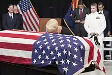 John McCain died at age 81 on August 25, 2018.[121] She was present at, and later expressed gratitude for, the elaborate services for her husband, which involved lying in state in the rotunda at the Arizona State Capitol, a service at the North Phoenix Baptist Church, lying in state in the United States Capitol rotunda in Washington, a service at the Washington National Cathedral, and finally burial at the United States Naval Academy Cemetery.[122]