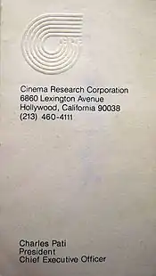 The Compound was located at 6860 Lexington Avenue, in Hollywood, California. It took up a square block. CRC was an early pioneer in the special effects community, and evolved into all areas of film related to pre- and post-production, until Charlie Pati's death in 2000 at 86 years old. During its heyday, his company was involved in over 670 full-length Hollywood movies. Charles Pati's passing ended Cinema Research Corporation, however others have used a DBA (Doing Business As) CRC, but none succeeded, and all are now defunct.[4]