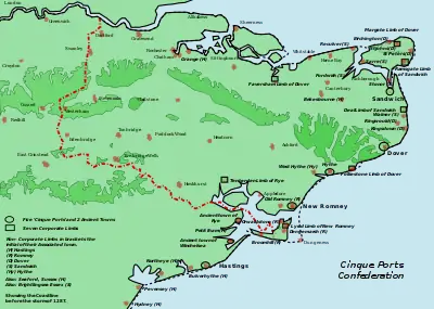 - Limbs of Hastings – Grange (now part of Gillingham, Kent), Bekesbourne, Bulverhythe, Northeye (former village in Sussex[4]), Eastbourne, Hydney (now Hampden Park, part of Eastbourne), Pebsham (small village between Bulverhythe and Bexhill-on-Sea [then as Bexhill]), Pevensey and Seaford (in Sussex)