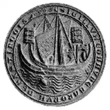 All Freemen of the ports, termed "portsmen", were deemed in the age of Feudalism to be barons, and thus members of the baronage entitled to attend the king's parliament - a privilege granted in 1322 in recognition of their earlier support of the Despensers, father and son.[12] Termed "Barons of the Cinque Ports", they reflected an early concept that military service at sea constituted land tenure per baroniam making them quasi feudal barons. The early-14th-century treatise Modus Tenendi Parliamentum stated the Barons of the Cinque Ports to hold a place of precedence below the lay magnates (Lords Temporal) but above the representatives of the shires and boroughs (Knights of the Shire and burgesses). During the deposition of Edward II, the chronicles made a specific point of noting the presence of the Barons in the embassy of deposition - "praecipue de portubus...barones des Portez" ('especially the [Cinque] Ports...the barones of the Ports').[13] Writs of summons to parliament were sent to the warden following which representative barons of the Cinque Ports were selected to attend parliament. Thus the warden's duty in this respect was similar to that of the sheriff who received the writs for distribution to the barons in the shires. The existence of common (i.e. communal) seals of the barons of the individual ports (see illustration) suggests they formed a corporation as the seal was designed to be affixed to charters and legal documents which would bind them as a single body.[14] This no doubt related to their privileges as monopolies. The warden and barons often experienced clashes of jurisdiction.[10]