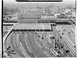 The site of the Cira Centre used to be a parking deck that sat over rail tracks across Arch Street from 30th Street Station in West Philadelphia, Pennsylvania.[1] Plans to develop the rail yards north and northwest of 30th Street Station had been around for decades. Among the proposed ideas for the rail yards included building a new city hall and, in the 1960s before Veterans Stadium was built, a sports stadium was proposed for the area. In 1970 Philadelphia considered holding a bicentennial exposition over the rail yards, and the area was also considered for the Pennsylvania Convention Center.[2] In 1985 an office, hotel and shopping complex was proposed by real estate developer Gerald D. Hines, and in 1992 an idea for a stadium was again proposed for the site.[3][4] Nothing ever came out of the plans.[1]