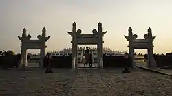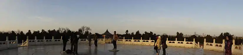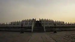 The Circular Mound Altar (圜丘坛 huán qiū tán) is an outdoor empty circular platform on three levels of marble stones, located in Beijing, China. It is part of the Temple of Heaven.