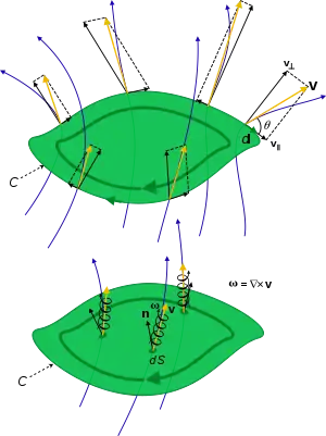 By Stokes' theorem, the flux of curl or vorticity vectors through a surface S is equal to the circulation around its perimeter,[2]