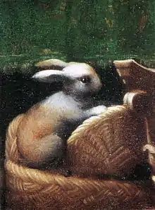 At the right are two rows of figures, as well as the priest who holds Jesus on the altar and, in the other hand, the ritual knife. Below, between the offers, are two small rabbits, which resembles similar details in the arch of the first chapel frescoed by Parmigianino in the church of San Giovanni Evangelista at Parma.