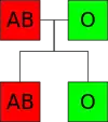 When testing paternity or maternity by ABO blood group alone, it is possible to have a paradoxical result in the rare instance that a cis-AB genotype is involved. For example, (scenario 1.1 above) a child of a cis AB individual (who will test as a regular AB phenotype) and an O individual will be either AB or O instead of the usual A or B (see diagram above).