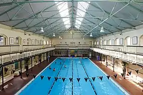 After a period of decline and demolition threats in the 1970s, the building was saved by a Builders Labourers Federation green ban.[4] Later being extensively renovated and restored in 1981–83, designed by Kevin Greenhatch with Gunn Williams & Fender.[5] The rear furnace and caretakers cottage were replaced with squash courts and gym space in a matching red brick, the pools were restored though most of the numerous changing booths were removed, most of the bath cubicles replaced with other facilities, and a single entrance stair created. The first class ladies baths with the "mikva bath" on the first floor were retained as the spa area.[6]