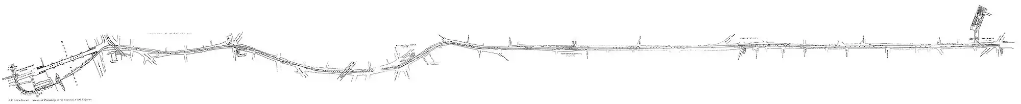 Shortly before it opened to the public, the C&SLR gave notice of its intention to submit another private bill to Parliament, to construct a new line from its northern terminus at King William Street towards Islington.[26] Because of the awkward arrangement of King William Street station, the extension was not to be connected directly to the existing running tunnels but was to be linked via a pedestrian subway through which passengers could make interchanges between the separate lines. The bill was rejected on the grounds that the extension failed to make a connection to the existing line.[27] In November 1891, the C&SLR published details of a revised bill for the extension to Islington.[28] The company had recognised the deficiencies of its King William Street station and, just a year after the line had opened, planned to construct a new pair of tunnels to bypass the problematic northern section.