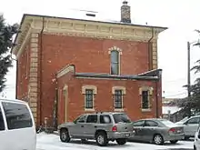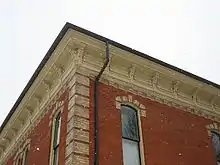 On the rear (south) facade is an attached one story structure that housed the men's jail cells. On its west facade the original steel and wood door is still extant and on its south facade there are three windows complete with metal bars. All of the jail building's windows and doors feature arched brick crowns, a theme repeating from the two-story portion of the structure. While the brick entablature and dentil work both reflect the main two-story building, the jail building lacks the overhanging eaves and brackets. The rear elevation of the main building has one second floor window.[2]