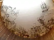 The library has a circular design with seven floors, glass facades, and stone-clad columns.[13] The building includes a 13-metre-tall (43 ft) vertical garden, the tallest in Perth, with more than 3500 plants.[14] The ceiling features a mural by artist Andrew Nicholls entitled Delight and Hurt Not, depicting the final act of Shakespeare's The Tempest illustrated with Western Australian flora and fauna.
