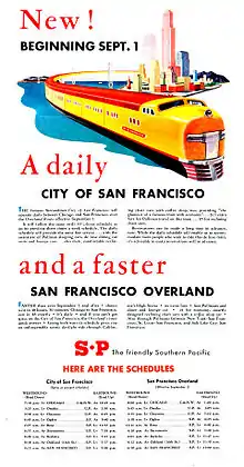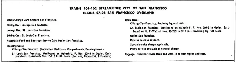 - July 16, 1962: The SP's San Francisco Overland (TR 27-28) ended its long run as a separate San Francisco/Oakland to Ogden year-round daily train when that service was consolidated with the City of San Francisco except for occasional summer and holiday seasonal extra section runs of the Overland which service ended on January 2, 1964.[34][35]