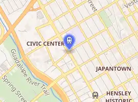 Civic Center is a light rail station operated by Santa Clara Valley Transportation Authority. The station is located in San Jose, California, on 1st Street just north of Mission Street. This station is served by the Blue and Green lines of the VTA Light Rail system.