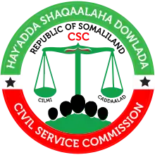 The Somaliland Civil Service Commission (Somali: Hay'adda Shaqaalaha Dawladda) is a Somaliland government agency established in 1993 that oversees the employment of civil servants and lead reforms in Somaliland's decentralisation process. The head of the agency is chairman and is appointed by the President of Somaliland. The current chairman of the agency is Farhan Aden Haybe.[1]