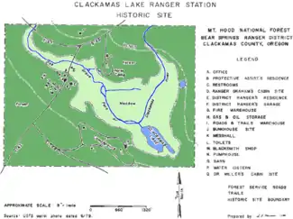 Because of the rustic architecture of the buildings and the site's unique historic value as an early Forest Service ranger station, the Clackamas Lake Ranger Station compound was listed as a historic district on the National Register of Historic Place in 1981.[4][5] The historic area covers 4 acres (16,000 m2).[6]