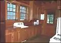 - The ranger station office was built in 1933. It is a one-story, wood-frame building with a concrete foundation. The high gable roof is covered with wood shingles. The stone chimney is slightly off-center from the roof ridgeline. The windows are four-over-four panes in a double-hung sash. The front entrance faces south and has a flagstone porch steps except for the final step, which is cut from a large peeled log. The office interior is divided into two rooms. The office walls are covered by painted wood panels, and the floors are varnished fir.[8]