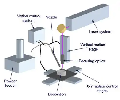 Laser cladding[2][3] is a method of depositing material by which a powdered or wire feedstock material is melted and consolidated by use of a laser in order to coat part of a substrate or fabricate a near-net shape part (additive manufacturing technology) .