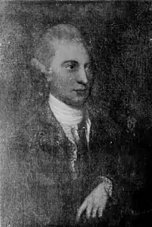 The 8th baronet suffered from ill health as a child and while still comparatively young he was injured in a hunting accident. He attempted to regain his health in a warmer climate, when he left the British Isles for Italy, in 1765. His health, however, finally failed him in 1766, when he died in Rome, where he was buried.[7][39] He was succeeded by his brother, Alexander, who was at the time, an officer in the Coldstream Guards.[39] A and A Macdonald described the 9th baronet as being of a completely different temperament than that of his older brother. They described his tastes as "if note wholly English, at least entirely anti-Celtic". The 9th baronet raised the rents upon his estates, and evicted many of the poorer tenants from their holdings. During his chiefship, several tacksmen in Skye and Uist gave up their leases and emigrated. When Boswell and Johnson visited Skye in 1773, they encountered an emigrant ship, filled with tacksmen and their tenants, about to set sail. In 1776, the 9th baronet was made Lord Macdonald in the Peerage of Ireland. In 1777, he offered to raise a regiment on his estates, which the Government accepted. The regiment was named the 76th Regiment of Foot (Macdonald's Highlanders) and was 1,086 men strong; 750 of whom were from the baronet's lands on Skye and North Uist.[40] The Macdonalds were well represented in the officers of the unit with men from the families of the Macdonalds of Glencoe, Morar, Boisdale and others.[41] The regiment embarked for New York, in 1779, and served with distinction the American Revolutionary War. It returned home, and was disbanded in 1784. In 1794, the baronet raised three volunteer companies in Skye and Uist, for the defence of the country and relief of the regular army.[40] He married Elizabeth Diana, eldest daughter of Godfrey Bosville of Gunthwaite, (in the County of York, England). He died comparatively young, in 1795, and was succeeded by his eldest son, Alexander Wentworth.[7][40]