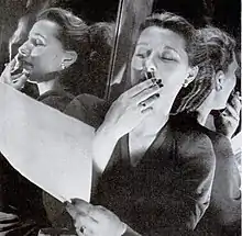 During the 1940s, well-known Potter designs included a two-piece bathing suit consisting of separate small top and bloomers, a sweater designed for evening wear, and a sidesaddle-draped skirt. Examples of these designs were featured in the 1998-1999 exhibition Designing Women: American Style 1940-1960 at the Wadsworth Atheneum in Hartford, Connecticut.[9] Her use of colour was distinctive, with one 1940s evening outfit consisting of a pink blouse, green belt, and pale blue skirt.[3] Other designs were made up in one single, unique shade, such as the blue wool dress worn by Eleanor Roosevelt to meet George VI and his queen consort, Elizabeth in London on October 23, 1942.[9] Roosevelt had been a fellow founder with Potter and others, of an association of women interested in advancing elegant and fashionable clothing for women, the Fashion Group International, FGI.[5][10] In 1946, Potter was awarded a Coty Award for her casual clothes and her distinctive use of colour.[4] She shared the award with Omar Kiam and Vincent Monte-Sano.[11] Although she is considered an important figure in the world of sportswear design, the curator Richard Martin has stated that Potter was "not a pure sportswear advocate, she was a figure with a discreet, negotiated relationship to sportswear."[1]