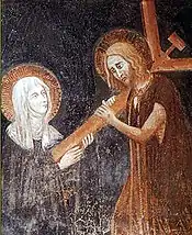 Immediately following Clare's death her heart was removed from her body, and upon inspection it was reported that symbols of Christ's passion, a crucifix and a scourge, were found within her heart.[3][4][5] Other historians report that an "autopsy" was conducted and a small crucifix was found in her heart and three gallstones were found in her gallbladder, which were taken as a symbol of the Holy Trinity.[6] Upon hearing the news of these signs, the vicar of the Bishop of Spoleto traveled to Montefalco "burning with indignation" suspecting that the nuns of the convent had planted the symbols. A commission consisting of physicians, jurists, and theologians was assembled to conduct an investigation, which subsequently "ruled out the possibility of fabrication or artifice".[3] The vicar of the Bishop of Spoleto, who came to Montefalco as an inquisitor eager to punish those responsible for fraud, came to be convinced of the authenticity of the findings after personally verifying that the signs were not the result of trickery.[3] However, doubts as to the veracity of the findings persisted even at the canonization proceedings, which were fraught with conflicts including a challenge from the Franciscans that Clare should not be canonized as a saint of the Order of Saint Augustine because she had been a Franciscan tertiary.[3] During the proceedings Tommaso Boni, a Franciscan from Foligno and formerly chaplain to Clare's community, stated that he suspected that the "symbols in her heart were planted by a nun from Foligno"; furthermore that John Pulicinus, who had been chaplain at the time of Clare's death, had opposed the veneration of the symbols found in her heart.[3][7]