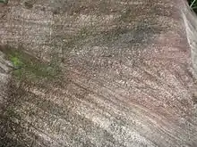 The basin was next uplifted and eroded and then deepened considerably and Bundamba group rocks form a complete V shape on both sides of the basin. In the northern parts the rock is mostly friable sandstone, but in the south it is divided into conglomerate below and siltstone above. The Laytons Range Conglomerate[10] rests on the basin floor and extends from Baryulgil, to Nymboida. The conglomerate often appears as a cliff. The Corindi Conglomerate is a local name for a hailstone sized gravel near Corindi. The Mill Creek Siltstone.[11] are often olive green or yellow-brown with bright red joint planes.[2]