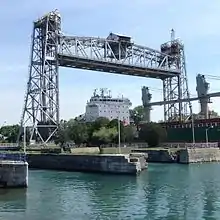 The Clarence Street Bridge (also known as Bridge 21) is a vertical-lift bridge located in Port Colborne, Ontario.[1] Built between 1927–1929 during 4th Welland Canal Construction, the bridge still serves today as a vital link connecting East and West Port Colborne. The structure uses simple electric motors and counterweights to raise the deck 36.5 meters (120ft.) above passing vessels. The raising and lowering of the bridge takes approximately 90 seconds. The western bridge approach, over former canal locks 26 and 27, was added when Bridge 21 was constructed, making these locks inoperable.