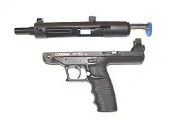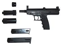 The Claridge Hi-Tec and its antecedent the Goncz High-Tech Long Pistol are semi-automatic pistols designed by Hungarian inventor Lajos John Goncz.[2][3] This unique firearm features a telescopic bolt design encased in a tubular upper receiver with a forged steel frame, button rifled match barrels, and 16-round magazines standard.