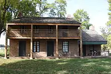The Broadwell Tavern was built in 1824 by innkeeper and land developer John Broadwell as an investment in the Springfield area. The businessman sensed that the nearby county seat of Springfield would grow and its residents would need to travel in and out. On the American frontier in the 1830s, a tavern typically doubled as a logistics center. The drivers of slow-moving, horse-drawn drays needed a place to spend the night where their horses could be fed and watered. Illinois law required taverns to provide these services as condition of receiving a license to serve alcohol by the drink. Although the hospitality of the Broadwell Tavern was never luxurious, the tavern's fireplaces kept the brick tavern warm, and glass windows helped encourage the guests to get up early and resume their journeys. The tavern was built in a vernacular Federal style.[2]