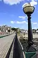 After a long campaign by local people to raise funds for restoration (supported by Sir John Betjeman, who described Clevedon as "the most beautiful pier in England"),[8] the pier eventually reopened. Some funds were raised by "sponsored planks" – small brass plaques with names or messages are inlaid on the wooden planks and benches, recording donations. Reconstruction of the pier spans and decking was completed on 27 May 1989, and the pier was reopened to great enthusiasm.[20] The pierhead was still shut, however, and it was not until 23 May 1998 that it was finally restored and opened to the public, as a result of funding from the Heritage Lottery Fund.[27] In 1999 the National Piers Society awarded Clevedon Pier the title of Pier of the Year, and it also won a Civic Trust Award.[21] The pier was re-designated a Grade 1 listed building in 2001,[22][28][29] the only other pier with this status being Brighton's West Pier (largely destroyed by fire and storms between 2002 and 2004).[30]