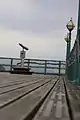 Six tanks were used for each span and left in place for three hours; the 18 tanks used in total allowed three spans to be tested simultaneously. At the end of the three hours the tanks were emptied and dragged along the deck to test further spans. The first six spans passed without problems, but under load the seventh span collapsed, bringing down the eighth and final span, leaving the pier head and pavilion standing.[26]