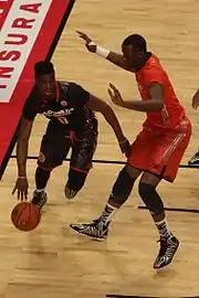 Alexander began the season coming off the bench.[144] On November 24, Alexander had his first double-digit output with 10 points against Rider.[145] In the 2014 Orlando Classic semifinals against Tennessee on November 28, he posted 16 points.[146] Then in the finals against #20 Michigan State on November 30, he contributed 4 blocks.[147] On December 5 during the Big 12/SEC Challenge contest against Florida, Alexander posted a team-high 10 rebounds along with 12 points for his first collegiate double-double.[148][149][150] On December 20, Alexander was expected to be in the starting lineup for the first time against Lafayette,[151] but he was not.[152][153] However, he started on December 22 against Temple.[154] On January 19 against #19 Oklahoma, Alexander posted 13 points and 13 rebounds.[155] The 13 rebounds in just 23 minutes played marked a career high for Alexander and an individual season high for the Jayhawks.[156] Alexander was named Big 12 newcomer of the week on January 26, 2015.[157][158] Alexander made his second start of the season on February 10 against Texas Tech, replacing Jamari Traylor in the lineup and posting 10 points, 4 blocks and 5 rebounds.[159][160] On February 28, Alexander was inactivated due to an undisclosed NCAA investigation as a precautionary measure.[161] He did not play any games after February 23 because of the investigation of his mother's initiation of pre-NBA draft loan processing.[162]