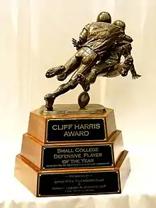The Cliff Harris Award is presented to the top defensive player in the country representing Division II, III and NAIA colleges and universities. The Selection Committee includes Roger Staubach, Lee Roy Jordan, Walt Garrison, Gene Stallings, Jackie Smith, Drew Pearson, Rayfield Wright, Everson Walls, Charlie Waters, Bill Bates, Gil Brandt, Mel Renfro, Jim Hart and Cliff Harris.