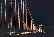 On 8 December 1864, the bridge was lit by magnesium flares for its ceremonial opening parade, but they were blown out by the wind.[36] The custom of lighting the bridge has continued with more recent events, although later thousands of electric light bulbs were attached to the bridge instead of flares.[37]